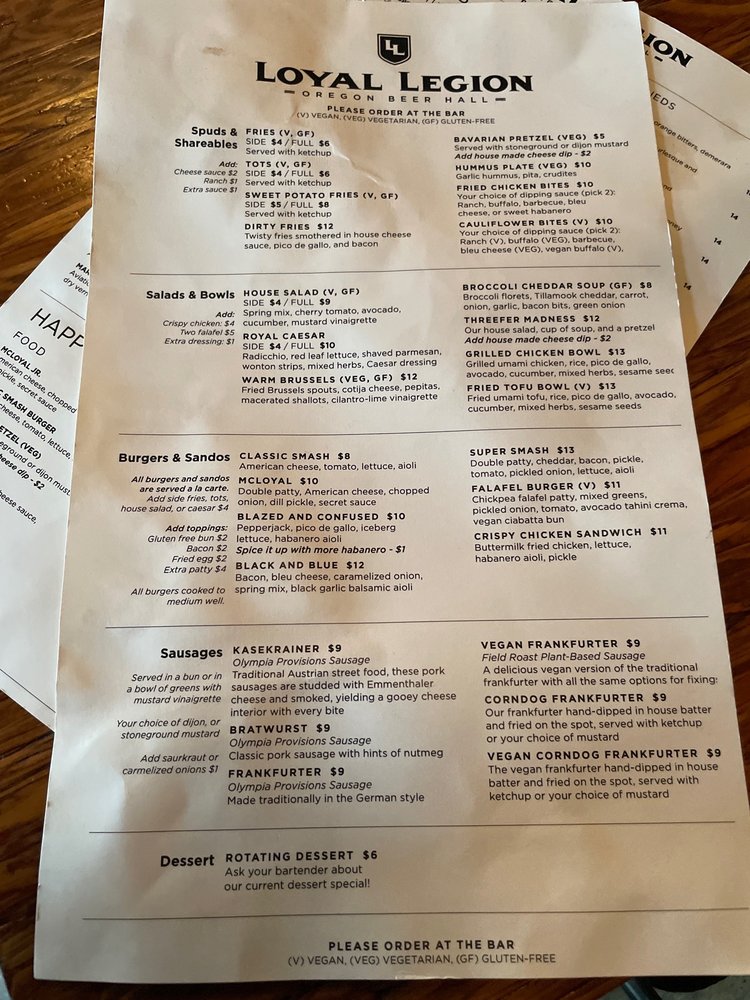 Located in Portland, OR, Loyal Legion offers a diverse menu in a cozy, woodsy atmosphere perfect for families and friends. With a strong emphasis on vegan and vegetarian options, this gastropub-whiskey bar-beer bar combo caters to a wide range of tastes. The bar boasts an impressive beer selection, including unique rotating NE-ipa's on draft. Customers rave about the creative cocktails, affordable prices, and attentive service. The menu features favorites like vegan corn dogs and fried cauliflower with house-made ranch dressing. The outdoor seating area is ideal for enjoying happy hour specials and $4 shots. Loyal Legion is a great spot for lunch, dinner, or late-night bites, with something for everyone to enjoy. Whether you're looking for a casual meal with friends or a date night experience, Loyal Legion has got you covered.